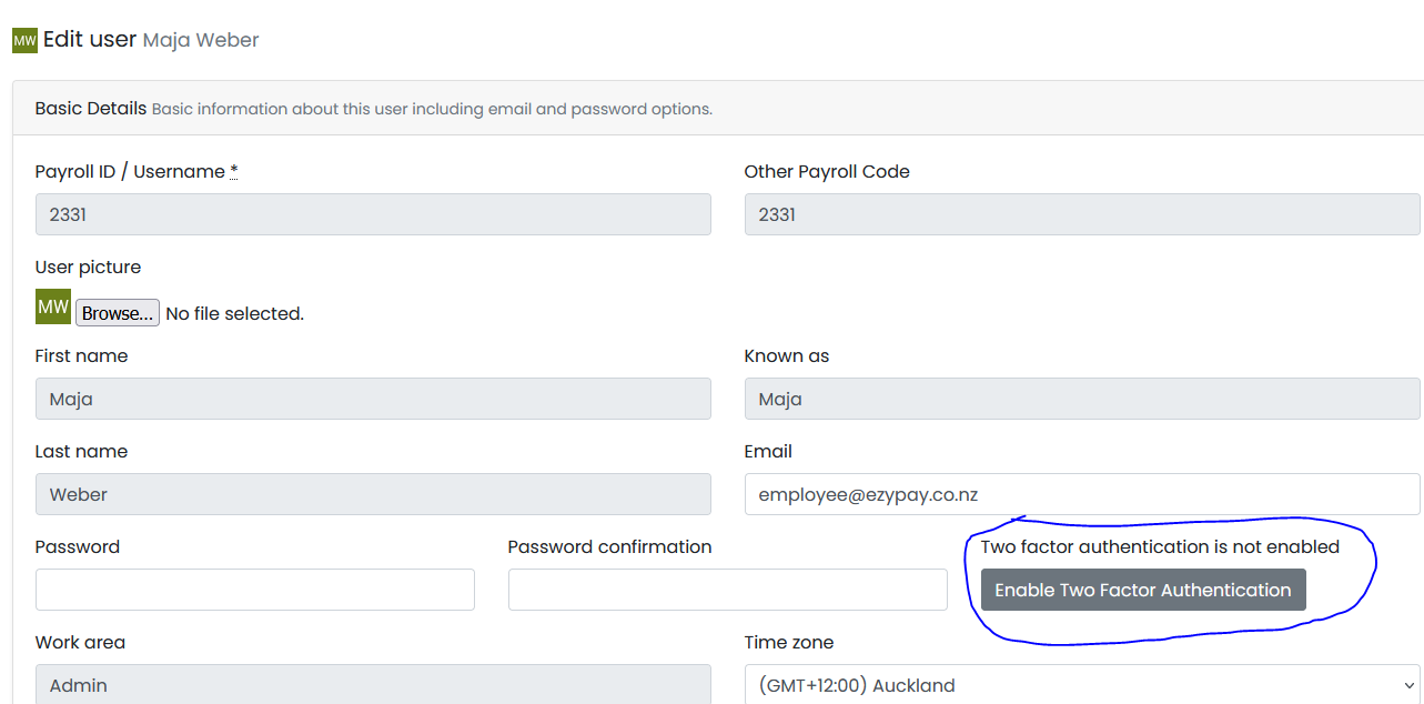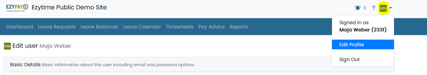To Enable 2FA, login to Ezytime with your Employee Code and on the top right corner, click on your Initials, then Edit Profile.
