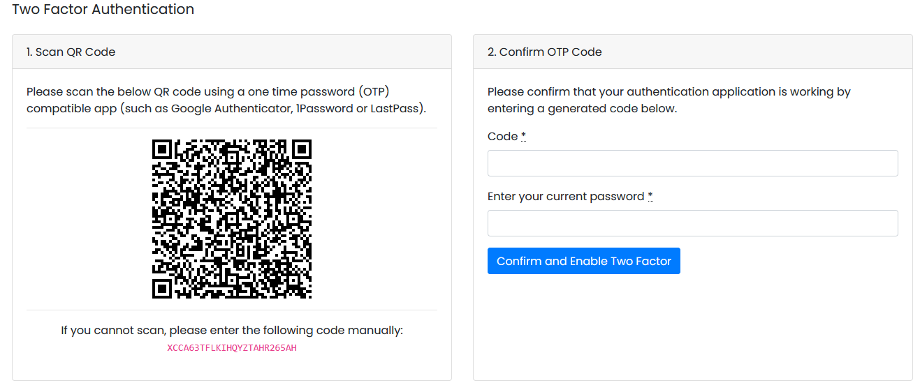 Once you have a code, enter it into the CODE field on the right hand side. Confirm with your Password and click on Confirm and Enable Two Factor.