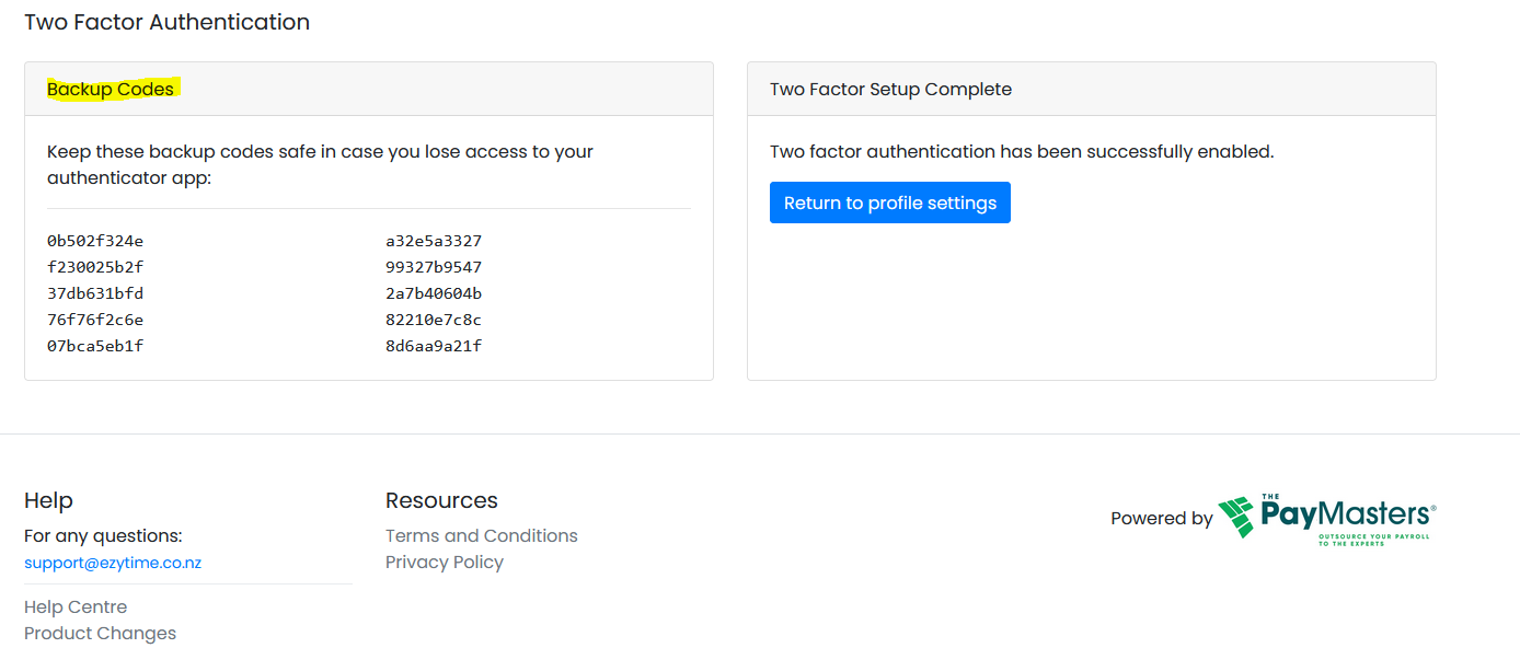 The below screen will then pop up with a list of Backup Codes. You should copy and save these codes in a safe place so that you can login to Ezytime should you lose use your phone.